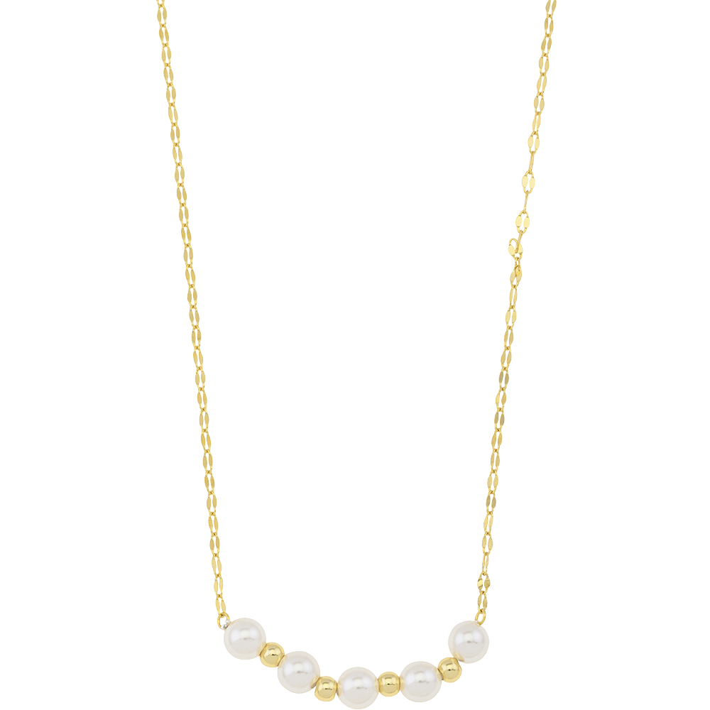 Ένα μίνιμαλ και διαχρονικό κολιέ κατασκευασμένο από ασήμι 925° υψηλής ποιότητας σε χρώμα χρυσού και μια σειρά από εναλλασόμενες επίχρυσες μπίλιες και μαργαριτάρια. Η αντίθεση του λευκού και χρυσού προσφέρει διακριτική κομψότητα, ενώ το ρυθμιζόμενο μήκος του από 40 έως 45 cm εξασφαλίζει ευέλικτο styling. Διαθέτει ασφαλές κούμπωμα με χαραγμένο το χαρακτηριστικό λογότυπο Breeze που εξισορροπεί την κομψότητα και την άνεση.
