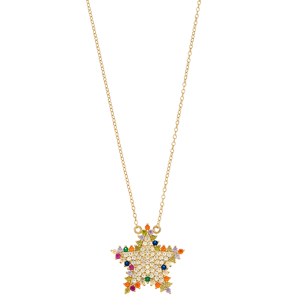 Κατασκευασμένο από 925° ασήμι, αυτό το κολιέ διαθέτει ένα εντυπωσιακό σχέδιο με αστέρι, το οποίο είναι διακοσμημένο με λευκά και πολύχρωμα ζιργκόν.
